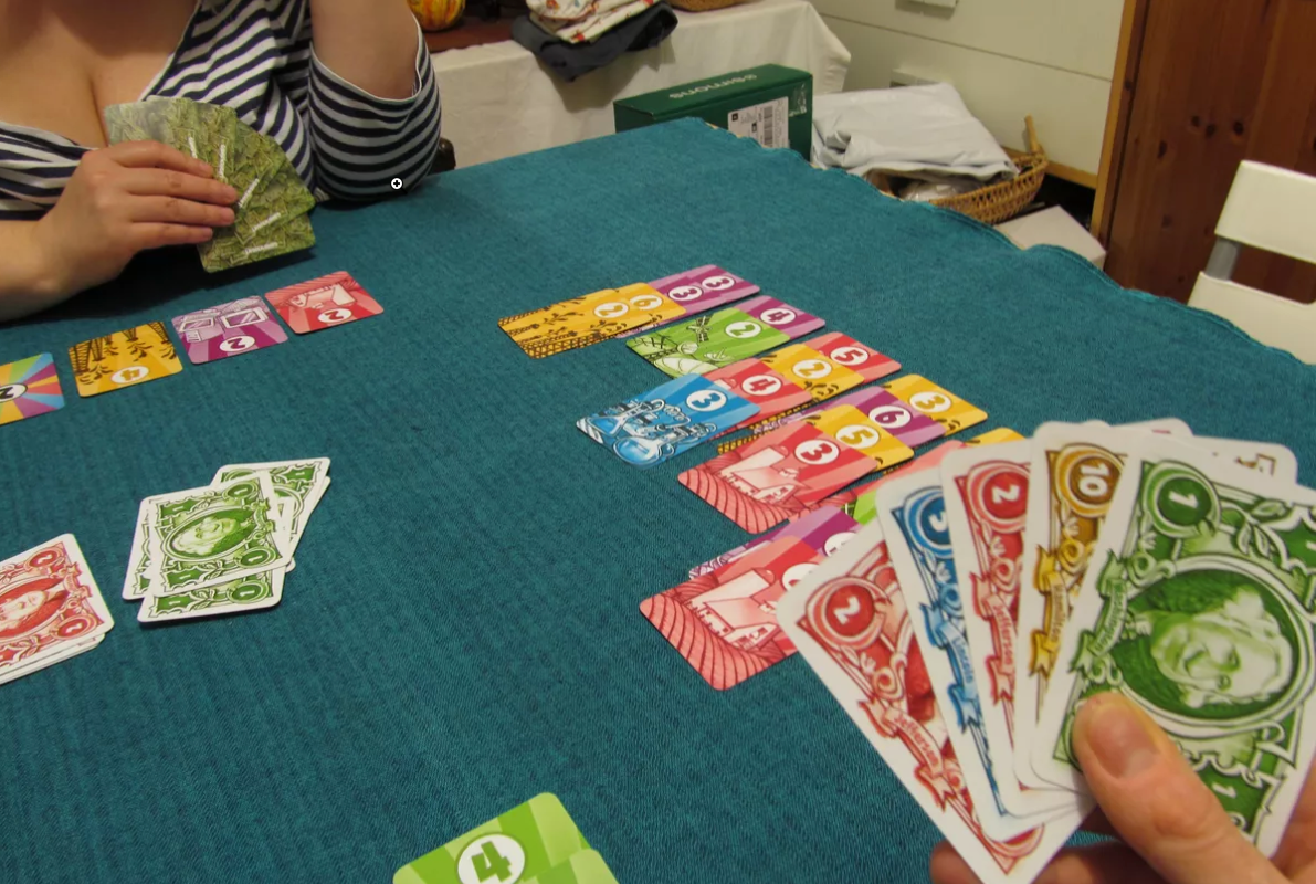 I løpet av din tur kan du enten 1) kjøpe ett kort eller 2) selge to kort av samme farge for en sum lik multipliseringen av de to verdiene deres. Du har også ett jokertegn som du kan bruke til å erstatte et annet kort én gang i løpet av spillet.